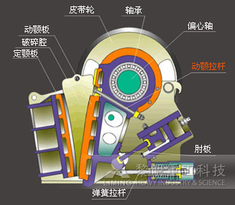 顎式破碎機(jī)破碎方式為曲動(dòng)擠壓型,運(yùn)作原理主要模擬動(dòng)物的兩顎運(yùn)動(dòng)。工作時(shí),電動(dòng)機(jī)驅(qū)動(dòng)皮帶和皮帶輪,通過偏心軸使動(dòng)顎上下運(yùn)動(dòng),當(dāng)動(dòng)顎上升時(shí),肘板和動(dòng)顎間夾角變大,從而推動(dòng)動(dòng)顎板向定顎板接近,物料通過兩顎板之間的擠壓、搓、碾等實(shí)現(xiàn)多重破碎;當(dāng)動(dòng)顎下行時(shí),肘板和動(dòng)顎間夾角變小,動(dòng)顎板在拉桿、彈簧的作用下離開定顎板,已破碎物料在重力的作用下,經(jīng)顎腔下部的出料口自由卸出。隨著電動(dòng)機(jī)的連續(xù)轉(zhuǎn)動(dòng),動(dòng)顎做周期性的壓碎和排料,實(shí)現(xiàn)批量生產(chǎn)。