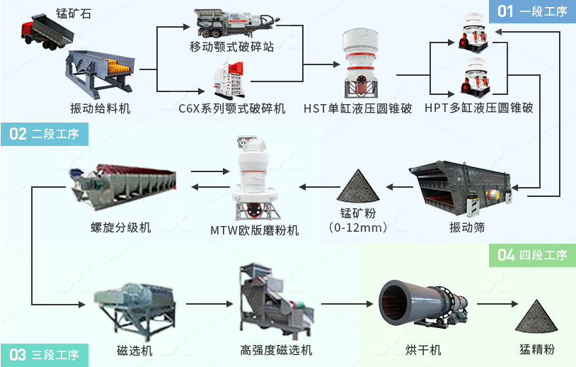第三階段:選礦將符合選礦要求的錳粉送入磁選機(jī)進(jìn)行強(qiáng)磁選來除去雜物,將獲得的錳粉送入烘干機(jī)烘干就可以獲得錳精粉。