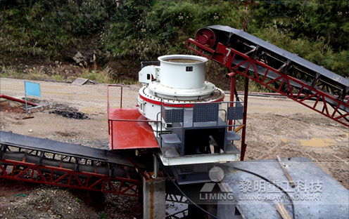 大塊石料經(jīng)料倉(cāng)由振動(dòng)給料機(jī)均勻地送進(jìn)顎式破碎機(jī)中粗碎,產(chǎn)出的粗料由皮帶輸送機(jī)輸送至液壓圓錐式破碎機(jī)細(xì)碎,細(xì)碎后的石料進(jìn)入制砂機(jī)整形,由振動(dòng)篩篩分出不同規(guī)格的砂石料。