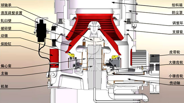 HPT液壓圓錐破碎機主要由機架部、支撐套部、調整環(huán)部、動錐部、偏心套部、傳動部和保險裝置部七大部件組成,主軸固定,電動機帶動傳動軸旋轉,傳動軸通過齒輪帶動偏心套繞主軸旋轉,再由偏心套帶動動錐部做偏心圓周擺動,從而實現(xiàn)連續(xù)的擠壓破碎石塊。