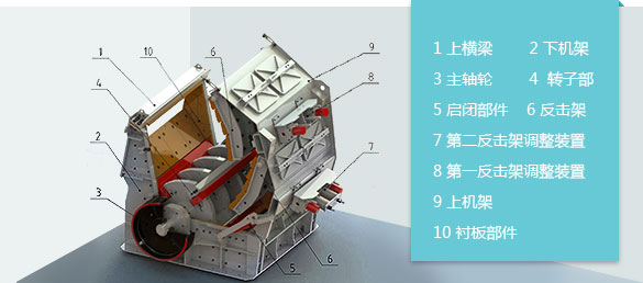 由機架部分、轉子部分、反擊架、翻蓋裝置和傳動部分組成。工作時,電機高速旋轉帶動轉子做高速運動。當物料由入料口進入機器時,受到轉子上的板錘高速撞擊而被破碎,然后被拋到反擊襯板上再次破碎,之后又從反擊襯板上彈回到板錘作用區(qū)重新破碎。在此過程中,物料之間也相互撞擊,達到破碎的效果。此過程重復進行,直到物料被破碎至所需粒度,由出料口排出。